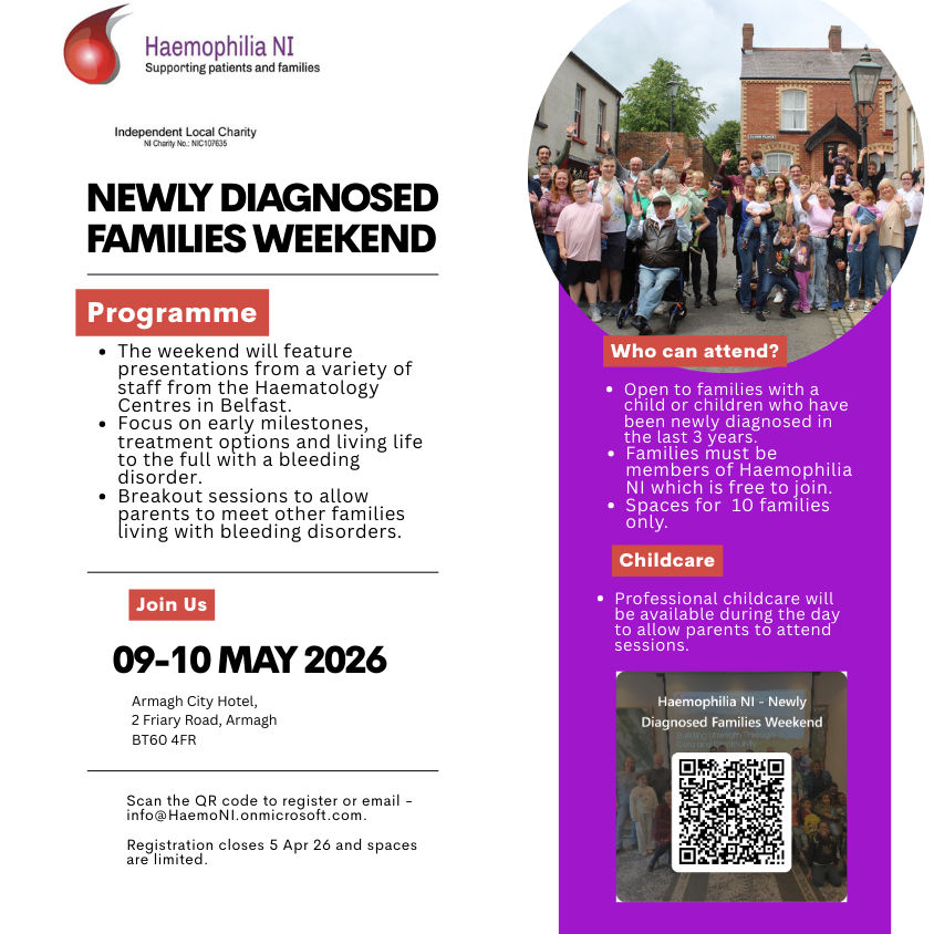 Newly Diagnosed Families Event. We are very pleased to announce a dedicated weekend event for families who have received a bleeding disorder diagnosis within the past three years. This supportive and informative gathering will take place from 9–10 May 2026 at the Armagh City Hotel. To ensure the event offers the best possible guidance, we are working closely with the Haemophilia Centres in Belfast to create a programme of educational presentations tailored to the needs of newly diagnosed families. These sessions will aim to provide clarity, practical advice and reassurance during what can often be an overwhelming period. In addition to clinical and educational content, we plan to host informal discussions with families who have older children living with bleeding disorders. Their insights and lived experiences can offer invaluable comfort, perspective and encouragement to those at the beginning of their journey. Despite major therapeutic advances in recent years, we know that receiving a diagnosis remains a challenging and emotional time — and our goal is to ensure families feel supported, connected and informed.